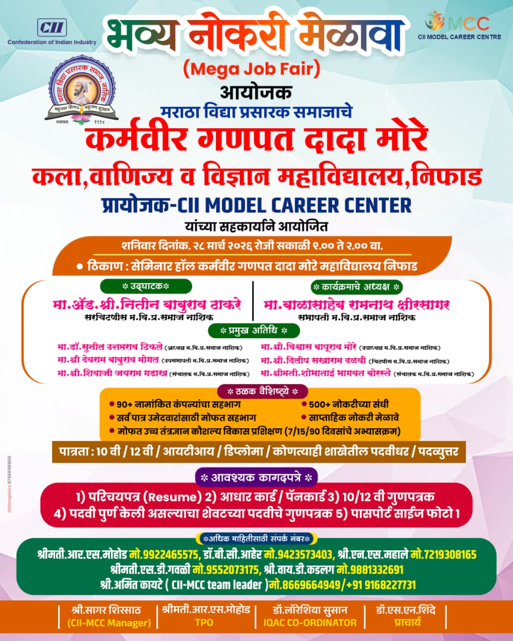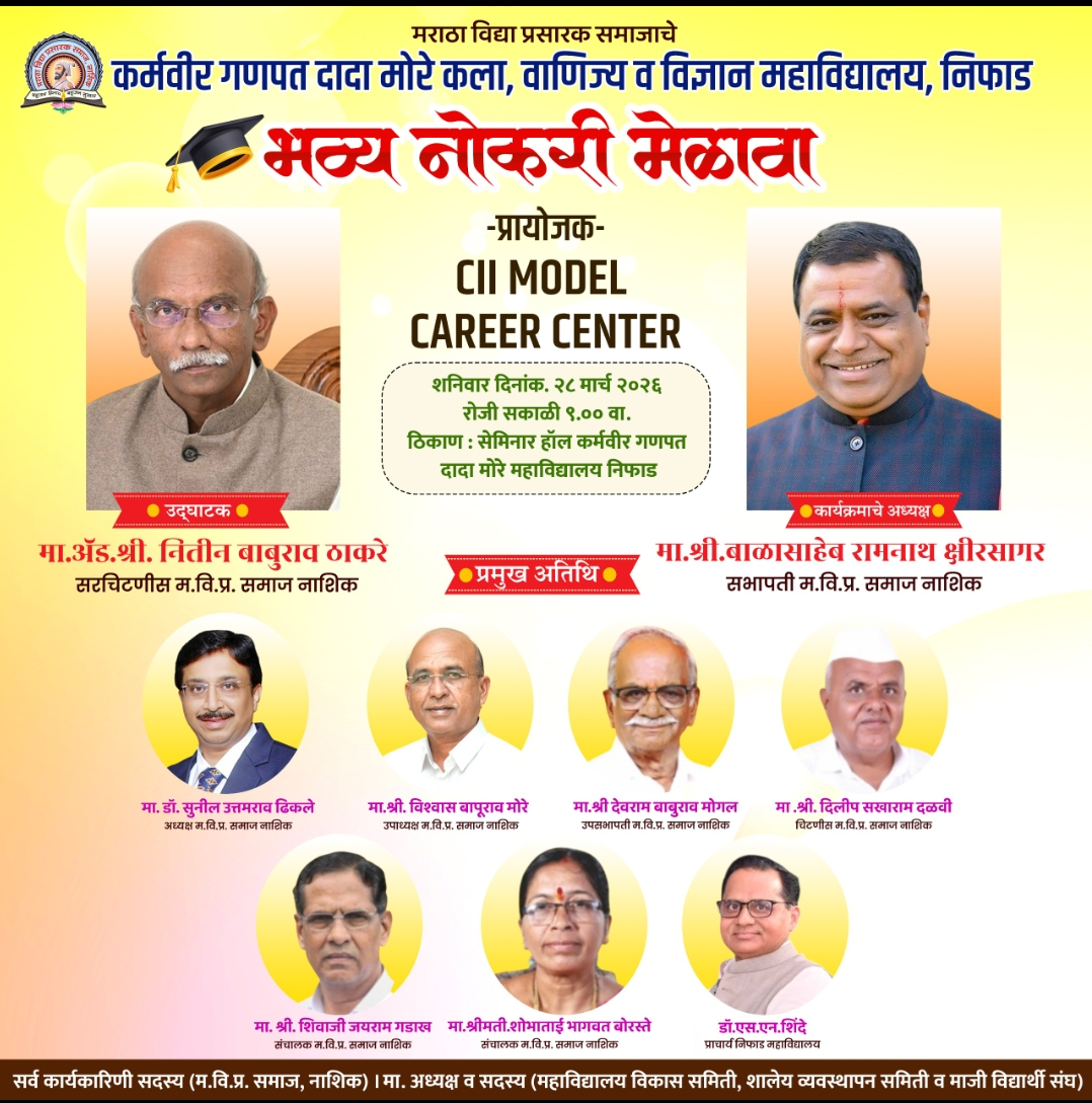 Karmaveer Ganpat Dada More Arts, Commerce and Science College, Niphad is run by Maratha Vidya Prasarak Samaj, Nashik, the Parent institution. The college was established in June-1971 with only 26 students at Taluka place Niphad from the rural area of Nashik district. It is one of the ten colleges in Niphad Tahasil. The college was established with view of catering higher education to the students from the villages and surrounding rural areas and also with the motto, ‘Bahujan Hitaya Bahujan Sukhaya’.
